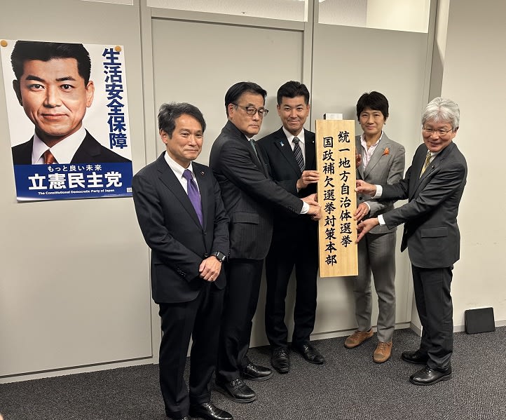 [写真]「統一地方自治体選挙国政補欠選挙対策本部」の看板が気をする泉代表、岡田幹事長、西村ちなみ・逢坂誠二両代表代行、大串博志選挙対策委員長、きょう午後3時半ごろ、宮崎信行撮影。