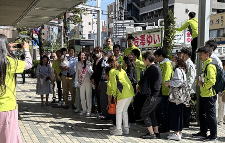 [写真]党首なしの5分ほどの街頭スポット演説後にスタッフ・ボランティアと記念撮影する、日本維新の会の金沢候補、宮崎信行撮影。