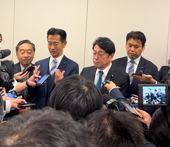 [写真]8日前の、自公国3党協議の後に、ぶら下がりに応じる自公の政調会長。余談だが、松本洋平・政調会事務局長は、自民党本部に鞄を置いたまま議員会館共用会議室に移動してしまったが随行のスタッフ(党職員か)が気を利かせて持ち会議終了後に手渡す「自民党しぐさ」を発揮した、2024年11月12日、宮崎信行撮影。