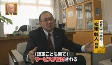 番組はまず大阪府知事の橋下徹さん(41)の取り組みを紹介した後、取材班は和歌山県・印南町に渡ります。このエピソードの詳細は、このエントリーの後ろに付けた、日高新報さんや、朝日新聞などの記事を先に目を通して頂ければ分かりますが、バンキシャが印南町に2つある幼稚園、4つある保育所を次々に訪ねると、園長さんは口々に「(2011年3月31日で)閉園になります」と。これは一体どうしたことか、という風情で、バンキシャが町役場の町長室に押しかけると、玄素町長が、すべての町立幼稚園・保育園を廃止して、4月からは、「認定こども園」をスタートすると説明します。