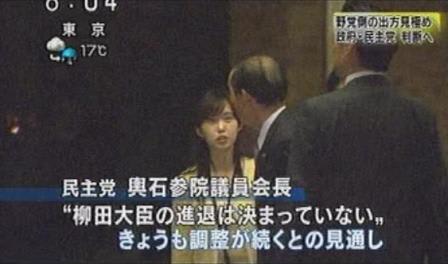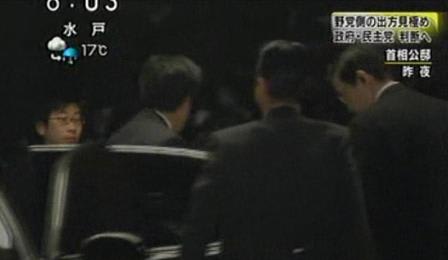この映像では、首相公邸前に2人の記者しかいませんから、公邸などの警備などの都合から、共同通信社と時事通信社の「ナショナル・フラッグ・ワイヤー」2社の記者が全報道機関を代表して取材する「共同・時事方式」という取材形式だと思います。時事通信記者はえらいのです。