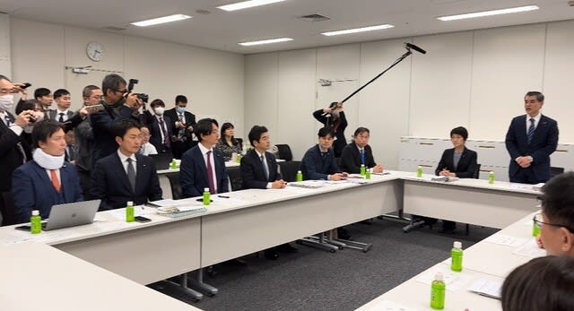 柴山昌彦さんら提出の自公国「法テラス法の特例及び宗教法人財産処分特例法案」(212衆法10号)と立維「解散請求された宗教法人の財産保全特例法案」が審議されました。まず、第一委員室で、法務・文部科学・消費者問題特別委員会連合審査会がありました。散会後には、衆議院第二議員会館で、柴山、西村両座長が「自公国」「立維」の5党協議を開きました=写真・宮崎信行撮影=が、冒頭から雰囲気は険悪。きょうは結論出ず、来週火曜日の採決より前に再会しましたが、決裂して、自公国案が国会の結論となるシナリオが濃厚になりつつあります。