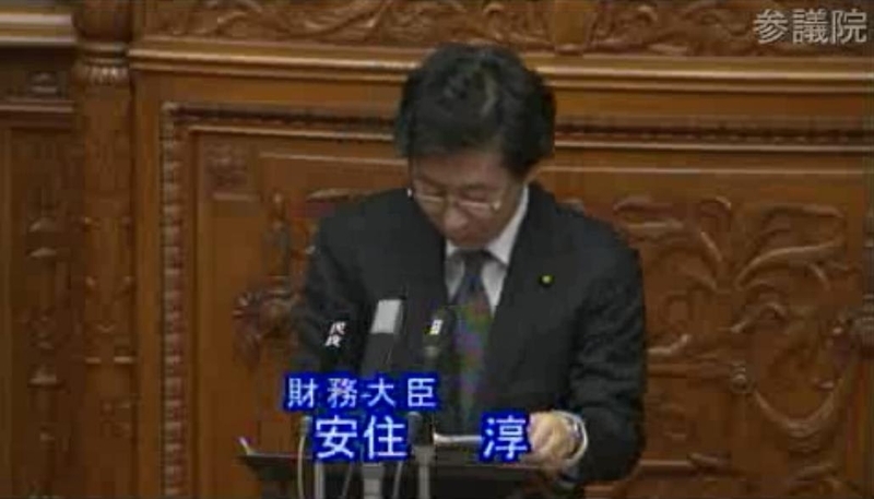 [画像]財政演説する安住淳・財務大臣、2011年10月28日、参議院本会議、参議院インターネット審議中継からキャプチャ。