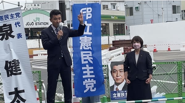 [写真]参議院全国比例では異例となる泉健太代表(左)の街頭応援演説を受ける、青木愛参議院議員(右)、ことし6月、宮崎信行撮影。