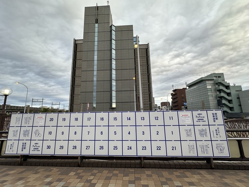[写真]当選者1人の都知事選の公営掲示板ポスターが48枠=東京・北区で、同区は都議補選(当選者1人)もあるので、左側の紙をはがすと都議補選ポスター枠になるのかもしれない。東京一極集中は立候補者数にも及んでいる。