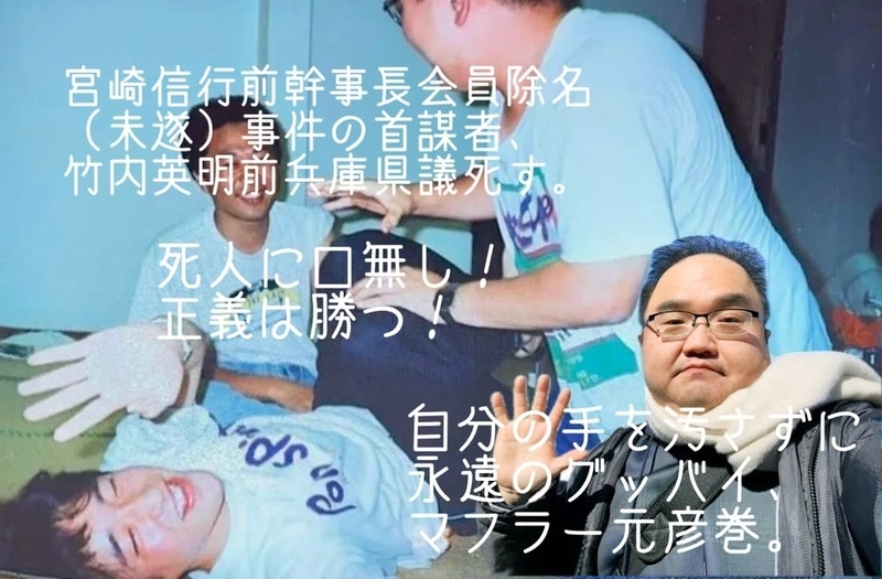 私は早稲田大学鵬志会の第8代幹事長ですが、退任の際に、後継幹事長ら4名に「前幹事長になった宮崎信行の会員としての除名」という謀略をはかられました。この首謀者が竹内英明さんです。私が都内の抜きん出た成功をおさめた実業家の子であるのに対して、竹内さんは600万円の債務を背負って進学しておりコンプレックスをいだいていたのだと思います。
