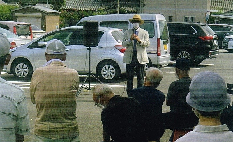 そうはいっても自由参加ですので、猛暑で、お盆で、コロナ禍で、豪雨で、と悪条件が重なれば参加者は減り気味。事前にアナウンスした以上行かねばならぬと岡田さんが会場を訪れたところ、意外にも一人高齢女性が。「あなたのお父さんには会ったことがあるけど、岡田さんに会ったことがなかったので、話を聞いてみたかった」という女性に、マイクを使わず、肉声で話しかけました。しばらくするとその気配を感じた、近隣の方々が出てきて、なんと10人の曇天座談会。10人とも意見を発言したそうです。あたかも民主主義の学校という風情だったようです。