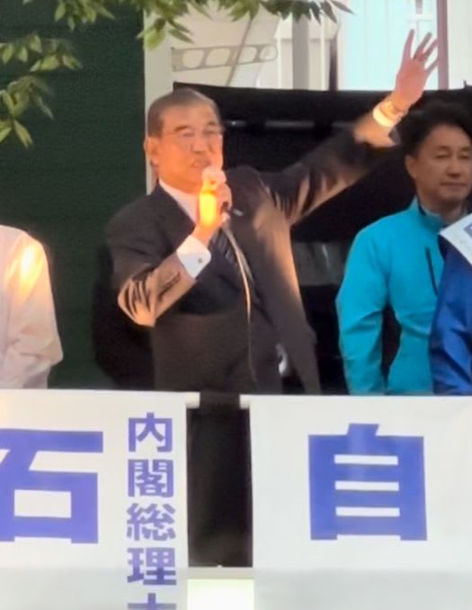 [写真]演説する石破茂首相、2024年10月26日、都内・中野区役所前で、宮崎信行撮影。
