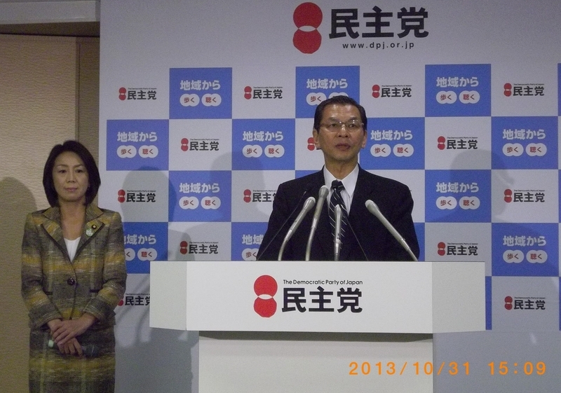 [写真]民主党の大畠章宏幹事長、左は記者会見司会の徳永エリ参院議員、2013年10月31日(木)、筆者撮影。