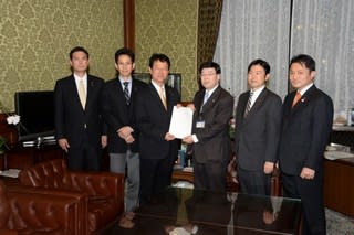 [写真]特定秘密保護法施行日延期法案を提出する、民主党の後藤祐一さん、階猛さん、大島敦さん、衆議院の向大野新治事務総長、維新の党の畠中光成さん、柿沢未途さん=民主党ニュースから。