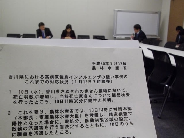 [写真]立憲民主党鳥インフルエンザ対策会議の配布資料(手前)と長妻昭政調会長ら、きょう平成30年2018年1月12日午後3時、衆議院第二議員会館、筆者・宮崎信行撮影。
