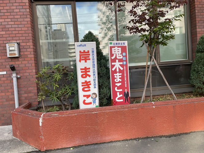 [写真]北海道自治労会館の立て看板のうち岸氏は枝野候補、鬼木氏は現職の泉候補の推薦人に回った、3年前の2021年10月、札幌で、宮崎信行撮影。
